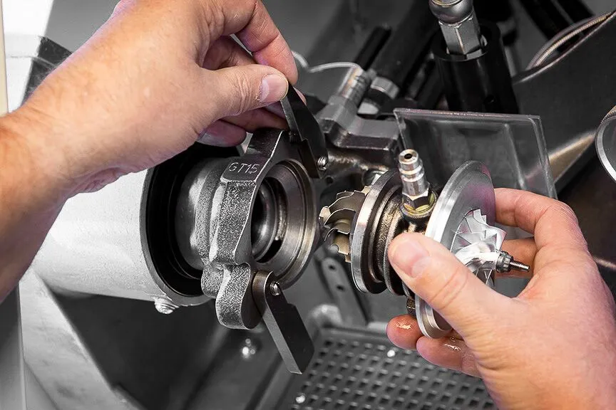 По време на балансиране, CHRA се монтира в адаптер чрез използването на бързо освобождаващи се скоби за задържането му. Корпусът на турбината от своя страна е прикрепен към гъвкаво монтиран въздушен маркуч, който насочва въздуха в корпуса, въртяйки вала на турбината. Акселерометър, прикрепен към монтажния фланец, измерва вибрациите на целия възел.